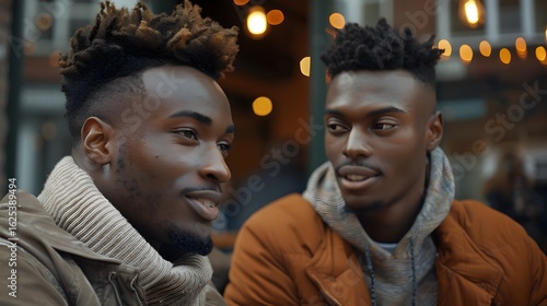 young men, african american, friends, talking, conversation, communicating, bonding, friendship, connection, outdoors, urban, city, evening, bokeh, blurred background, casual attire, authentic, lifestyle, happy, positive, diverse, youth, adult, socialising, interaction, genuine, portrait, candid