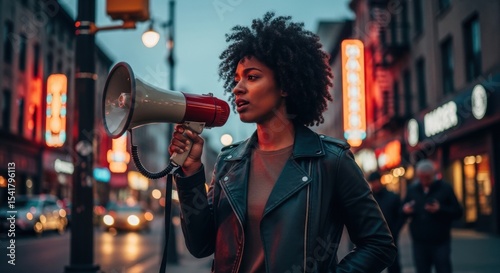 woman, megaphone, protest, activism, city, street, urban, night, dusk, speaker, demonstration, rally, advocate, communication, public, leader, message, action, social, justice, equality, right, freedom, community, people, crowd, diverse, young, adult, curly hair, african american, black, female, event, movement, power, strength, determination, expression, standing, downtown, neon, light, voice
