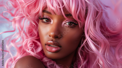 woman, wig, pink, beach, hair, fashion, beauty, face, children, fun, funny, glamour, smile, make-up, model, blue, smiling, person, circus, colours, crazy, expression, coiffure