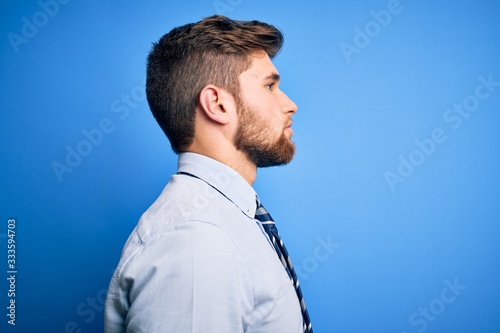 Young blond businessman with beard and blue eyes wearing elegant shirt and tie standing looking to side, relax profile pose with natural face with confident smile.