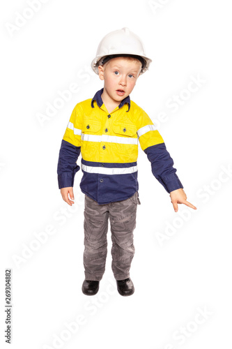 Young blond caucasian boy pointing down with a fierce look role playing as a construction worker supervisor in a yellow and blue hi-viz shirt, boots, without white hard hat, a hammer and tape measure.