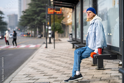 Young blond guy student waiting transport very long time in morning.Man on bus stop with coffee away. Blonde hair millennial man on bus stop in city. Modern urban transport for everyone
