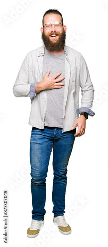 Young blond man wearing glasses Smiling and laughing hard out loud because funny crazy joke. Happy expression.