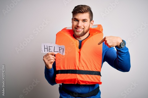 Young blond man with beard and blue eyes wearing lifejacket holding paper with help message with surprise face pointing finger to himself