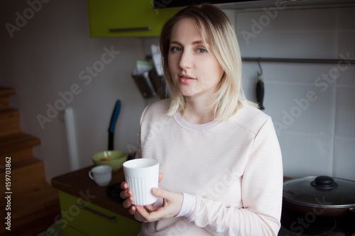 Young blond woman at home. Girl holding Cup of tea, portrait in the kitchen