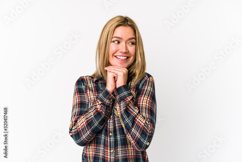 Young blonde caucasian woman isolated keeps hands under chin, is looking happily aside.