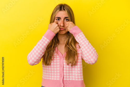 Young blonde caucasian woman isolated on yellow background whining and crying disconsolately.