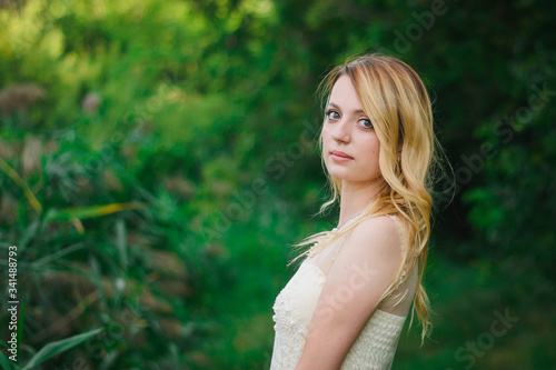young, blonde girl, of Slavic origin, in a white dress of the bride against the background of summer green nature. A girl in a white dress among green trees in the forest
