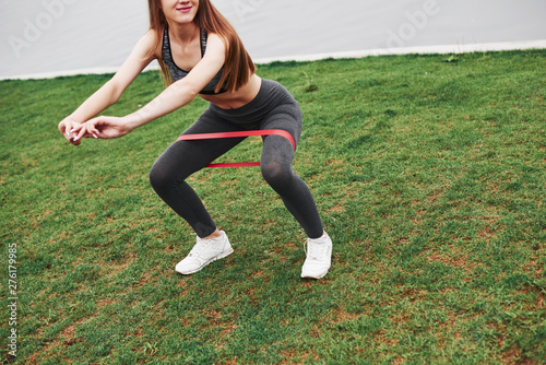 adult, female, girl, red, view, green, background, front, woman, young, person, wear, youth, white, training, physical exercise, activity, sport, action, motion, health, care, outdoors, outside, black, pant, grass, 1, human, energy, exercise, physical, practice, wellness, athlete, competition, session, fitness, daytime, daylight, blond, body, squatting, slim, full, height, sky, tape, vertical