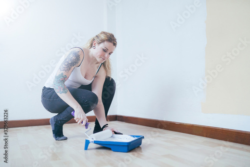 Young blonde inked woman painting a room bent down
