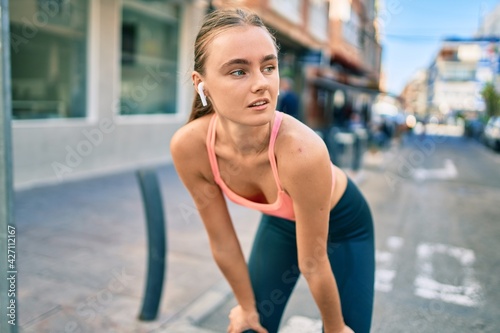 Young blonde sportswoman tired resting with hands on knees at the city.