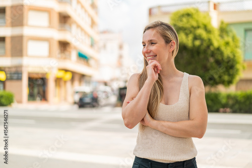 girl, woman, people, person, female, woman, young, adult, blond, background, outdoors, exterior, outside, hispanic, caucasian, casual attire, lateral, looking, head, face, portrait, look, eye, concept, side, smile, laugh, happy, happiness