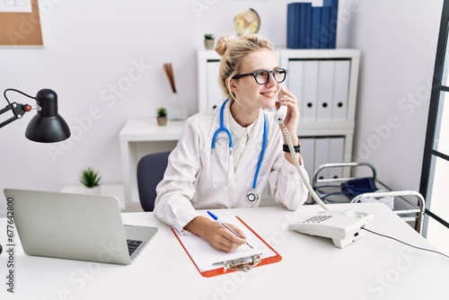 Young blonde woman doctor talking on telephone writing on document at clinic