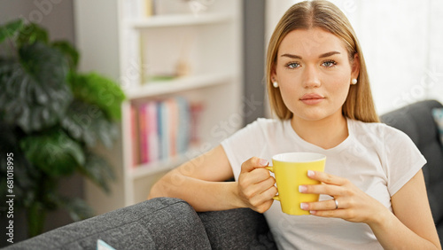 Young blonde woman drinking coffee sitting on sofa at home