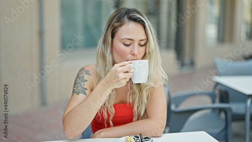 Young blonde woman drinking coffee sitting on table at coffee shop terrace