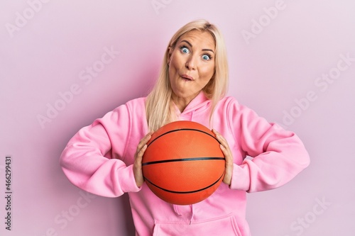 Young blonde woman holding basketball ball afraid and shocked with surprise and amazed expression, fear and excited face.