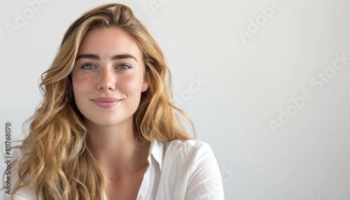 missy, blonde hair, white blouse, attractive, confident, portrait, elegant, wavy hair, serene, beauty, fashion, lifestyle, charming, bright, healthy, natural makeup, stylish, young adult, feminine, head shot, comfortable