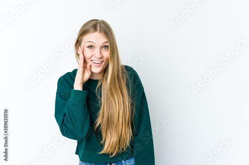 Young blonde woman isolated on white background shouts loud, keeps eyes opened and hands tense.