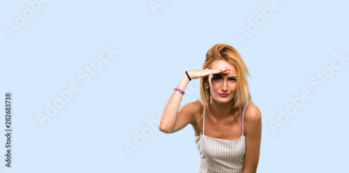 Young blonde woman looking far away with hand to look something over isolated blue background