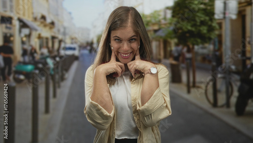 Young blonde woman playfully pushing cheeks with fingers on a busy street filled with blurred storefronts and parked scooters; happiness.