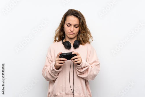 Young blonde woman playing at videogames