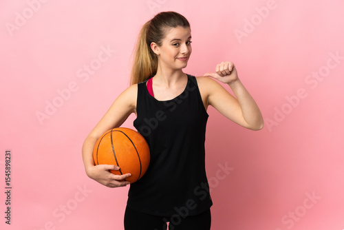Young blonde woman playing basketball isolated on pink background proud and self-satisfied