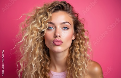 Young blonde woman with curly hair pouts lips for kiss. Studio portrait against vibrant pink background. Blue eyes, detailed makeup, fashionable style convey playful glamour and beauty.
