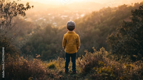 Young boy gazing at a scenic view from a hillside, enjoying the golden hour sunset