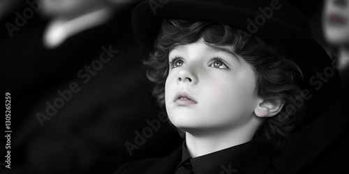 boy, hat, funeral, sorrowful, portrait, children, black-and-white, looking up, emotion, curly hair, serious, sombre, eye, expression, youth, grief, attire, formal, sitting, crowd, innocence, melancholy, moment, stillness, thoughtful, gaze, pensive, solemn, atmosphere, remembrance, loss, nubes, feeling, quiet, hope, longing, memory, deep