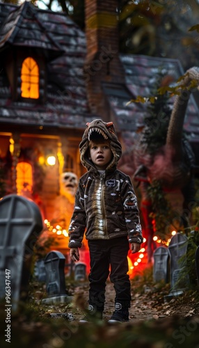 Young Boy in Dinosaur Costume in Front of Haunted House with Graveyard Theme for Halloween Night