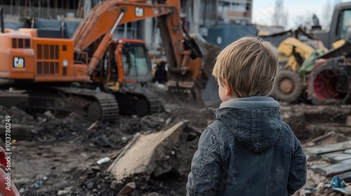 boy, young, construction, equipment, standing, edge, dirt, machinery, site, curious, children, innocence, landscape, back, serious, activity, waiting, heavy, yellow, shoveling, loader, industry, development, exploration, sharpened, metal, ground, vehicle, childlike, wonder, environment, scene, playful, watching, shoveling, adult, labor, urban, adventure, play, safety