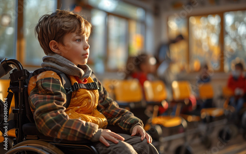 young, boy, sitting, wheelchair, mobility, disability, disabled, children, children, handicap, special, need, inclusive, assistance, support, health, condition, medicals, equipment, wheel, chair, indoor, lifestyle, care, looking, calm, expression, face, neutral, wall, background, room, accessibility, therapy, rehabilitation, adaptation, comfort, aid, technology, independence, adaptive, differently, generative, ai