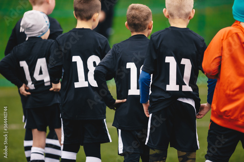 Young boys in sports team. Kids watching penalties on soccer tournament competition. School boys in jersey sports shirts and uniforms with numbers on back