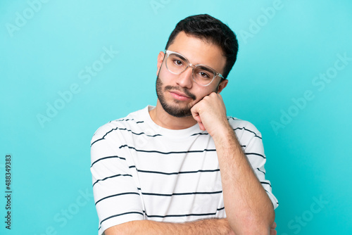 Young Brazilian man isolated on blue background With glasses and with sad expression