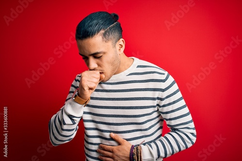 Young brazilian man wearing casual striped t-shirt standing over isolated red background feeling unwell and coughing as symptom for cold or bronchitis. Health care concept.