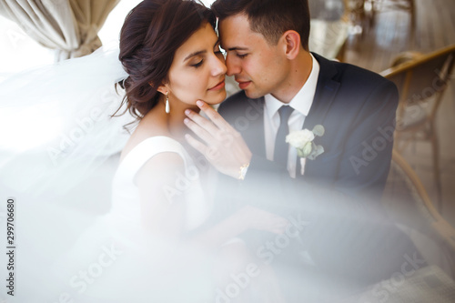 Young bride and groom in a cafe. Husband and wife hold each other's hands. Loving couple in a restaurant. Groom kissing a bride. Pretty bride and stylish groom. Wedding day. Marriage.
