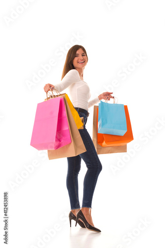 attractive, background, bag, bag, beautiful, beauty, buy, buyer, colourful, commercial, client, fashion, fashionable, female, gift, girl, hair, happy, jean, joyful, lady, leg, market, model, natural, package, person, portrait, posing, present, pretty, buyer, sale, shop, shopper, studio, style, stylish, surprise, white, woman, young, smile