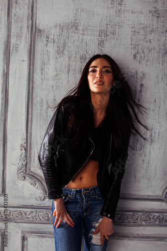 young brunette woman in leather jacket at vintage wall, lifestyle people concept