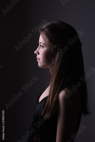 young brunette woman on black background