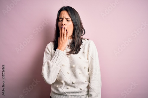 Young brunette woman with blue eyes wearing casual sweater over isolated pink background bored yawning tired covering mouth with hand. Restless and sleepiness.
