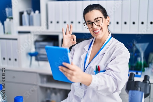 Young brunette woman working at scientist laboratory using tablet doing ok sign with fingers, smiling friendly gesturing excellent symbol