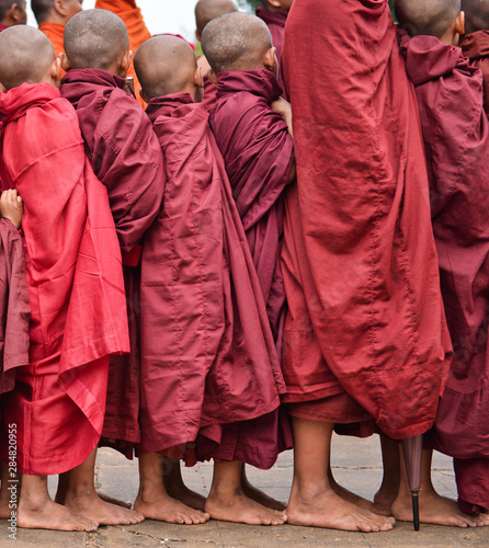 young buddhist pilgrims dressed in red traditional robes waiting to receive merit in myammar