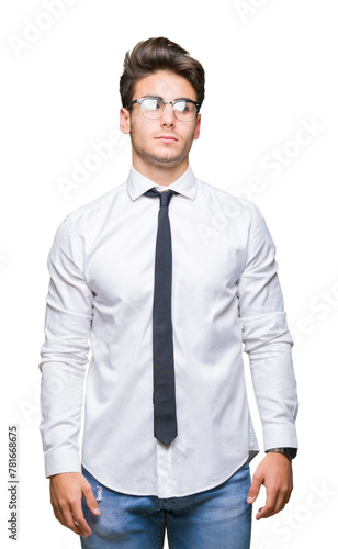 Young business man wearing glasses over isolated background smiling looking side and staring away thinking.