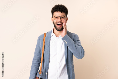 Young business Moroccan man isolated on beige background with surprise and shocked facial expression