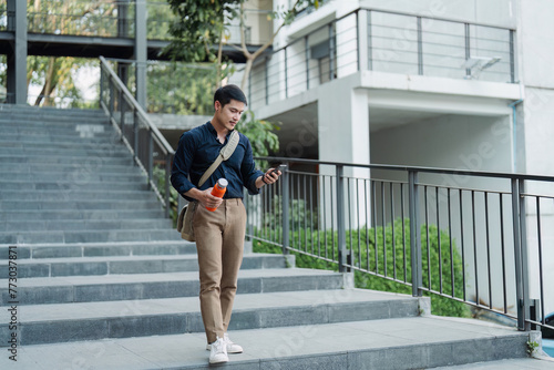 Young business professional walking at business center using mobile and carry bag