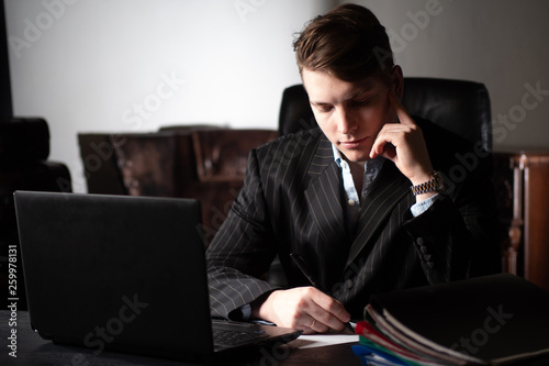 Young businessman at work. Man at the computer. A man writes at his desk. Young entrepreneurs. Business success. Career. Business Industry. Work until the evening. The man stayed at work.