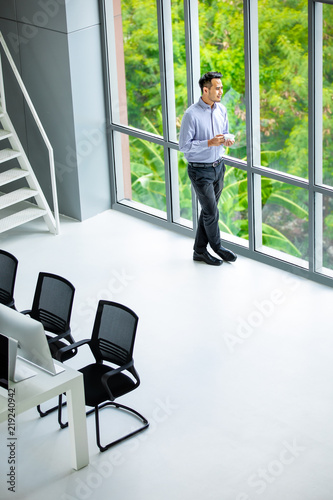 Young businessman holding a cup of coffee standing the window looking away in modle office, with a green tree as a background.
