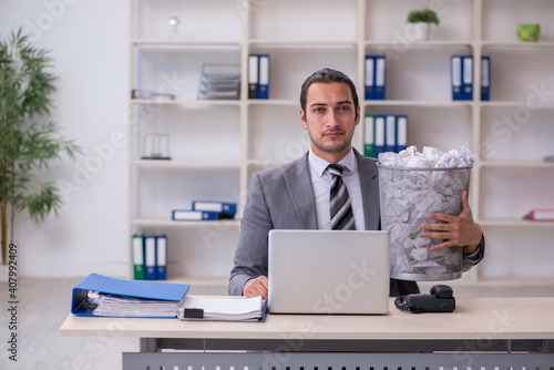 Young businessman rejecting new ideas with lots of papers