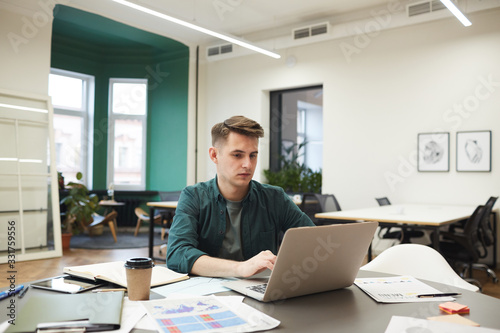 Young businessman sitting at the table among documents and typing on laptop computer he communicating online in modern office