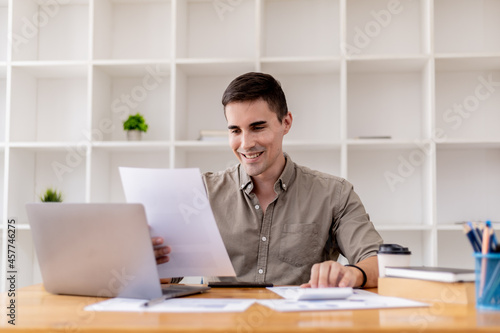 Young businessman sitting in office with laptop, he is reading company financial briefs, he founded a startup, he is a young entrepreneur who is skilled in running a growing company.